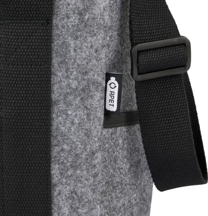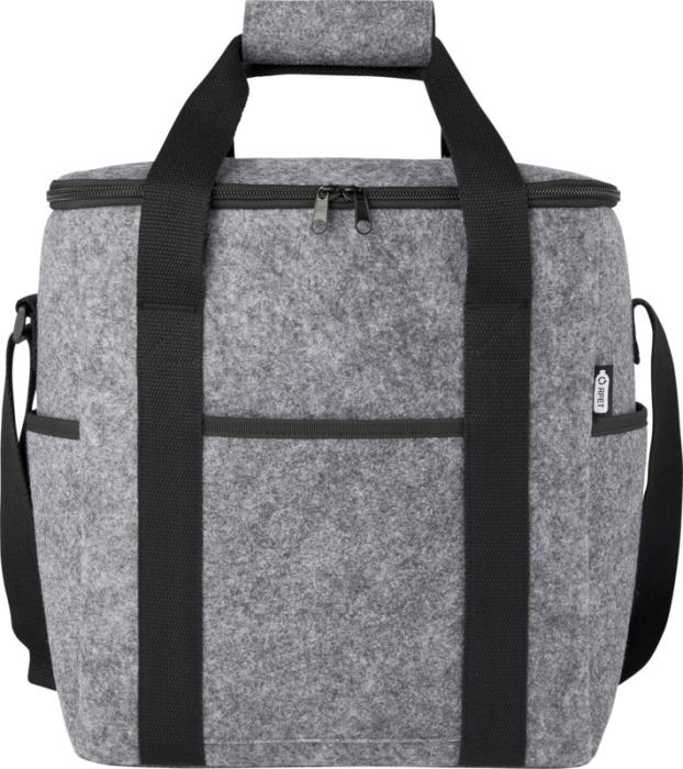 Large cooler bag made of high quality soft and durable GRS certified recycled felt. Features a large main compartment (six 1.5 litre bottles) lined with food safe and extra thick high density thermal PEVA insulation keeping beverages and refreshments cold for hours. Top zipper closure, front pocket, and two side pockets for extra storage. Adjustable long cotton woven shoulder straps (55 x 3.8 cm) and 2 woven cotton carry handles (25 x 3.8 cm) with top hook & loop closing. Easy to clean. Capacity: 21 litres.