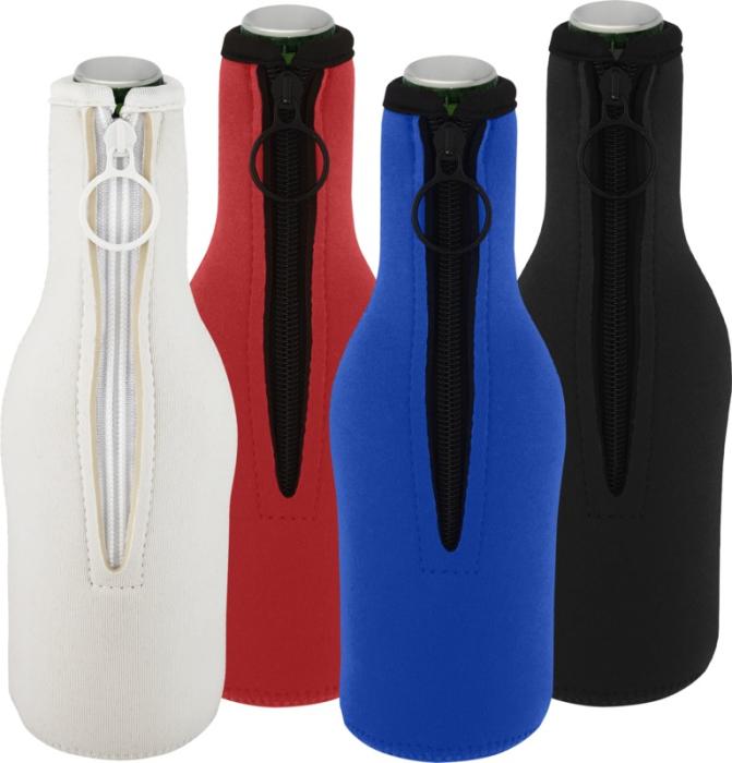 Recycled neoprene bottle sleeve holder that folds easily to Fit: in your pocket or purse. It has extra insulation keeping the beverage cool for a longer time, while also making the bottle comfortable to hold.